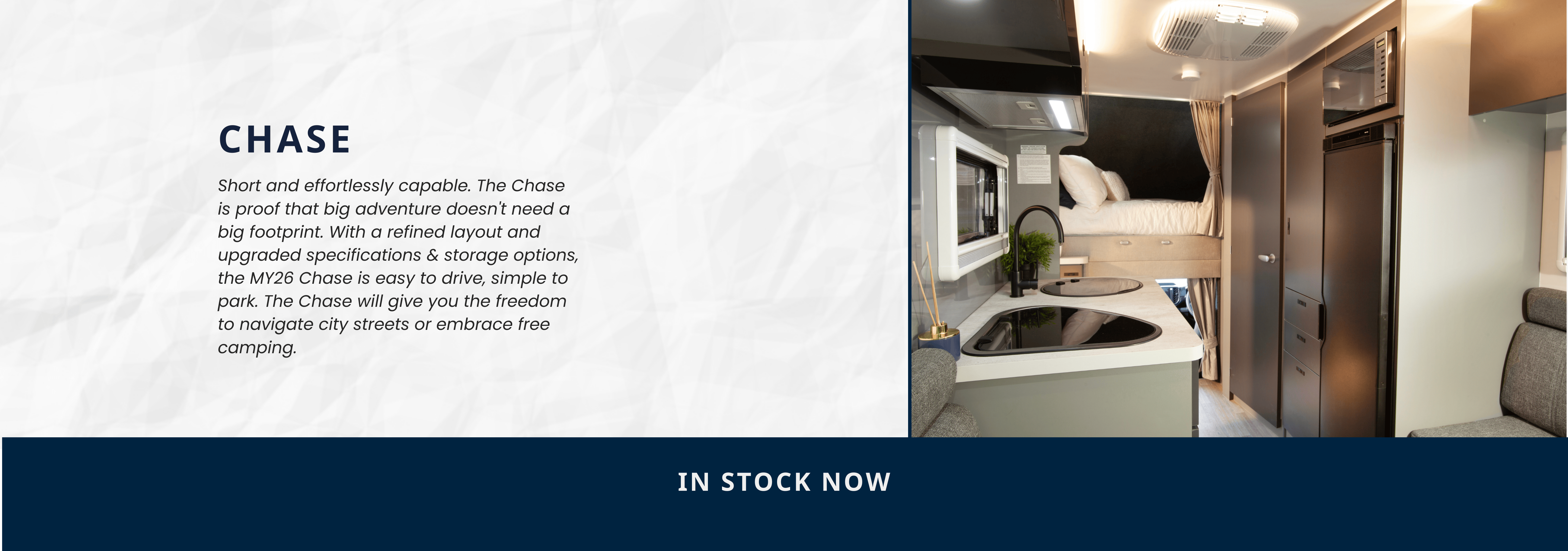 The Chase is designed for solo or twin travellers who love exploring. At home on city streets and suburban driveways, the Chase gives you the flexibility to go places where regular motorhomes can not.